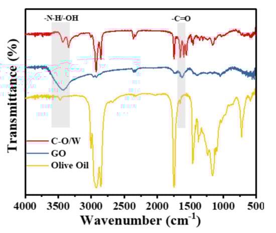 We further investigated whether olive oil had been successfully encapsulated in the GO nanosheets and composite shell of PU. Figure 4 shows the FT-IR spectral results of the GO nanosheets and C–O/W microcapsules. For the GO nanosheets, the sharp peak appearing near 1729 cm−1 indicates the stretching vibration absorption peak of C=O; the characteristic peak of –OH near 3400 cm−1 proved the successful preparation of the GO nanosheets [28]. In contrast to the GO nanosheets, the characteristic peaks of C=O and -OH were present in the spectra of the C–O/W microcapsules, indicating that the GO nanosheets had been successfully attached to the microcapsules. The characteristic peak at 3300 cm−1 originated from N–H in PU [29]. In addition, the saturated C–H stretching vibration peak at 2925 cm−1 and the stretching vibration peak of C–O of triglycerides at 1165 cm−1 proved the presence of polyurea as well as of olive oil in the C–O/W microcapsules [30]. Based on the results of the above analysis, it was shown that the olive oil had been successfully encapsulated in the composite shell layer of GO nanosheets and PU.