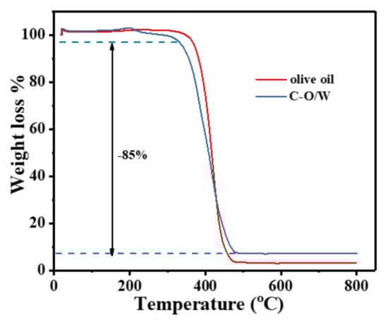 In order to investigate the thermal stability of the C–O/W microcapsules and the encapsulation rate of olive oil, the thermal degradation (TGA) behavior was evaluated in this study. In Figure 5, the weight loss curves of the C–O/W microcapsules and olive oil are basically the same, with decomposition starting at 380 °C, and thermal decomposition accelerating at 400 °C and finally remaining constant at 450 °C, which indicated a weight loss of olive oil encapsulated in the microcapsules [31]. The weight loss of 5.0 wt% in the C–O/W microcapsules from 200 to 380 °C was due to only the evaporation of water from the microcapsules, the decomposition of the PU shell layer, and the weight loss of GO functional groups [32]; 10 wt% of undecomposed residue remained after reaching 450 °C. Therefore, the encapsulation of olive oil in the C–O/W microcapsules reached a value of 85 wt%. The thermogravimetric results proved the successful preparation of the C–O/W microcapsules.
