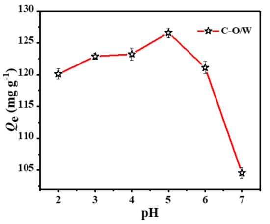 The pH of a solution is one of the most important factors affecting the adsorption performance of an adsorbent, as it affects the solution chemistry of phenolic compounds, the activity of the adsorbent and the removal efficiency of CPs. Therefore, the adsorption of 3,4,5-TCP by the C-O/W microcapsules was evaluated by varying the pH of the test solution (2.0–7.0). Figure 6 shows the effect of the solution pH on the adsorption of 3,4,5-TCP. The amount of adsorption Qe varied with increasing pH. In the pH range of 2.0–4.0, the effect of pH on the adsorption performance was small. An obvious change in the adsorption of 3,4,5-TCP by the C-O/W microcapsules occurred around pH = 5.0. This change may be related to the degree of ionization of chlorophenols in aqueous solution [33,34]. The pKa value of 3,4,5-TCP in aqueous solution is 7.20 at 298 K. Phenol can dissociate in solution and reach a dissociation equilibrium; when pH < 5.0, phenolic compounds exist mainly in molecular form. When pH > 5.0, phenolic compounds exist mainly in the form of negatively charged phenol ions, which leads to the disappearance of hydrogen bonds and thus to a decrease in adsorption. These experiments indicated that the adsorbent showed a good adsorption ability in the presence of the neutral molecular form of 3,4,5-TCP [35]. Therefore, the subsequent adsorption performance studies were carried out at pH = 5.0.