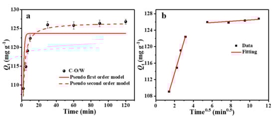 The adsorption performance is inextricably linked to the adsorption kinetics and was assessed by determining the amount of the target contaminant adsorbed by the adsorbent for different contact times. The results are shown in Figure 7a. The adsorption capacity of the C-O/W microcapsules for 3,4,5-TCP increased rapidly from 0 to 20 min, which was attributed to the presence of a large number of adsorption sites in the adsorbent at the beginning of adsorption, and then reached 92% of the maximum capacity within 40 min. As the adsorption sites were gradually occupied, the adsorption capacity became saturated, and finally the adsorption equilibrium was reached after around 60 min. In order to gain insight into the adsorption kinetic process, quasi-primary and quasi-secondary kinetic equations were used in this study (Equations (3) and (4)), and the data were fitted and analyzed [36]: