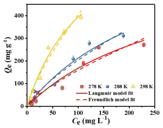 where Qm (mg/g) denotes the maximum adsorption capacity, and KL (L/mg) is the Langmuir adsorption constant. In addition, KF (mg1−n·Ln/g) is the adsorption constant in the Freundlich isotherm model, and 1/n is a constant for the adsorption conditions, indicating the measured values of support and surface inhomogeneity during adsorption, with values of 1/n < 1 reflecting favorable adsorption conditions.