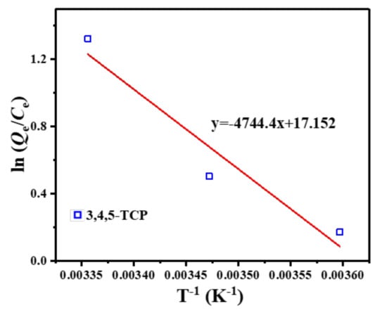 The linear curves fitted from the data are shown in Figure 9, and the relevant data calculations are presented in Table 3. The negative values of ΔG in the studied temperature range indicated that the adsorption of 3,4,5-TCP was a spontaneous process [42]. The positive value of ΔH indicated that the adsorption process in this study was heat-absorbing in nature, and therefore higher temperatures were favorable for the adsorption reaction. In addition, the ΔS values of the adsorption processes were all positive, indicating an increase in the stoichiometry of 3,4,5-TCP adsorption at the solid–solution interface. These results are consistent with those of the Langmuir isotherm. Thus, it was demonstrated that a high temperature is favorable for the removal of 3,4,5-TCP.