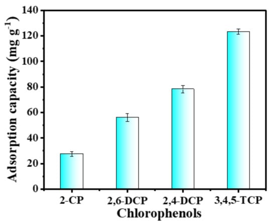 In order to investigate the adsorption capacity of the C-O/W microcapsules with respect to different chlorophenols, 5.0 mg of adsorbent was placed into the test solutions of four chlorophenols (2-CP, 2,6-DCP, 2,4-DCP, 3,4,5-TCP) at the same concentration (150 mg L−1), and the supernatant was analyzed by UV spectrometry after 2.0 h of static adsorption at room temperature [43]. The amounts of 2-CP, 2,6-DCP, 2,4-DCP and 3,4,5-TCP adsorbed by the microcapsules were 27.55 mg/g, 56.12 mg/g, 78.25 mg/g and 123.26 mg/g, respectively, as shown in Figure 10. The results indicated an effect of the chloride substituent content in the chlorophenol. The higher the number of chlorine substituents, the more hydrophobic chlorophenols are, and according to the adsorption mechanism based on a hydrophobic interaction between olive oil and PEDs, the higher their adsorption by the adsorbent is. Since the C–O/W microcapsules showed the best adsorption ability towards 3,4,5-TCP, the subsequent experiments focused on the adsorption of 3,4,5-TCP.