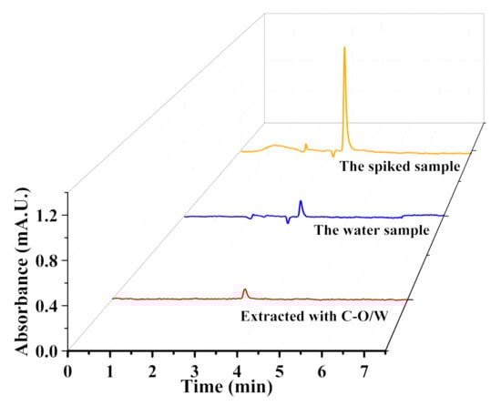 The removal of 3,4,5-TCP from real samples containing various impurities is also an important criterion for evaluating the properties of adsorbents. In this study, water samples from the Yudai River at Jiangsu University were taken as the actual samples and used to prepare a 3,4,5-TCP solution at a concentration of 50 μg/L. A certain amount of adsorbent was introduced, and the mixture was subjected to a watershed shock for 1.0 h to promote the adsorption. The concentration of 3,4,5-TCP was subsequently measured using high-performance liquid chromatography. The results are shown in Figure 12. The original solution contained almost no 3,4,5-TCP, while the spiked solution showed a peak corresponding to 3,4,5-TC at about 4.0 min. After adsorption by the adsorbent, the peak decreased significantly. The above result indicated that the C-O/W microcapsules had the ability to remove 3,4,5-TCP also from an actual sample.