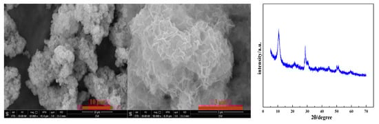 The addition of the NaOH solution induced yttrium ion precipitation as yttrium hydroxide, and because the supersaturation of the system was high, a large amount of yttrium hydroxide nucleated, grew, and agglomerated [21]. As shown in the SEM image in Figure 1, flower-like agglomerates are formed through the agglomeration of a large number of nanosheet crystals. The XRD analysis shows that its diffraction peak is broad and weak, and it is an amorphous precipitate.