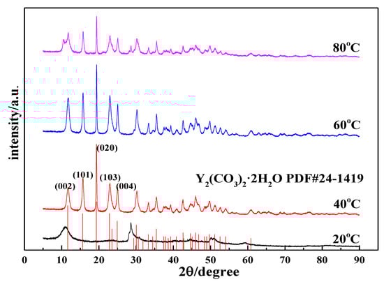 Figure 4 shows the XRD patterns of the carbonization products. When the reaction time is 90 min, the product obtained using carbonization at 20 °C is an amorphous precipitate. We tested its chemical composition and found that its carbon content was lower than at other temperatures. After comparing the XRD patterns of yttrium hydroxide, the XRD patterns of the two samples are similar, indicating that the product is incompletely carbonized yttrium hydroxide, which further shows that the carbonization is incomplete at low temperatures. This phenomenon is consistent with the corresponding SEM image. When the carbonization temperatures are 40 °C, 60 °C, and 80 °C, the carbonized products are all Y2(CO3)3·2H2O (ICDD card No 24-1419) [30]. As the carbonization temperature changes, the diffraction peak intensity of yttrium carbonate crystals changes, indicating that the crystal form changes. When the temperature increases from 40 °C to 60 °C, the diffraction peak of the (020) crystal plane of the yttrium carbonate crystal does not change significantly, but the diffraction peaks of the other crystal planes are clearly enhanced, such as the (002), (101), (103), and (121) planes. This indicates that the growth rate of each crystal plane of yttrium carbonate changes and undergoes two-dimensional growth, consistent with the phenomenon observed in the SEM analysis. As the temperature increases to 80 °C, the characteristic peak of yttrium carbonate is clearly weakened, and miscellaneous peaks appear at angles of 10.67° and 28.66°, indicating that the product is not completely carbonized and converted into yttrium carbonate, which confirms the results of the abovementioned SEM analysis.