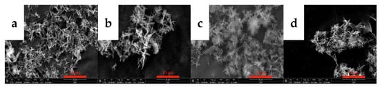 SEM images of carbonized products generated at different yttrium hydroxide slurry concentrations (carbonization temperature: 40 °C; carbonization stirring speed: 700 rpm; carbon dioxide flow rate: 0.1 L/min) (a): 0.05 mol/L; (b): 0.1 mol/L; (c): 0.15 mol/L and (d): 0.25 mol/L.