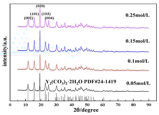 The concentration of the Y(OH)3 slurry exerts a certain effect on the concentration of Y3+ in the slurry and the carbonization process. The carbonization of yttrium hydroxide slurries with concentrations of 0.05, 0.10, 0.15, and 0.25 mol/L was conducted to explore the effect of the concentration of the yttrium hydroxide slurry on the morphology and phase type of the carbonization product, and samples were collected and tested after carbonization for 90 min. The results are shown in Figure 7 and Figure 8.