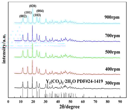 XRD patterns of carbonized products obtained at different stirring speeds (carbonization temperature: 40 °C, yttrium hydroxide concentration: 0.15 mol/L; carbon dioxide flow rate: 0.1 L/min).