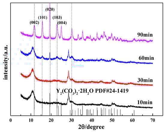 Figure 11 shows the XRD pattern of the carbonized product generated during the carbonization process. As shown in Figure 11, when the carbonization time is less than 30 min, the carbonized product has a wider diffraction peak that is close to the diffraction peak of the initial yttrium hydroxide and poor crystallinity. However, with the extension of carbonization time, the intensity of the diffraction peaks is slightly weakened, indicating that a large amount of yttrium hydroxide is not carbonized at this time. When the carbonization time is 60 min, the characteristic peak of yttrium carbonate begins to appear in the XRD pattern, but the peak intensity is weak. Carbonization continued until t = 90 min, and the carbonization product was completely converted into crystalline yttrium carbonate. By comparing the XRD standard (JCPDF#24-1419) and the test results, the carbonized product is tengerite-type carbonate yttrium. Among them, the diffraction peak corresponding to the (020) crystal plane is relatively strong, clearly indicating that oriented growth occurs in the (010) direction, which is consistent with the structure of tengerite-type yttrium carbonate that easily grows in a one-dimensional orientation, as reported in the literature [32].