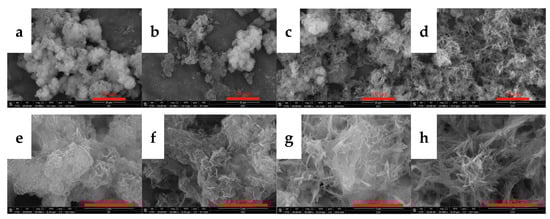 SEM images of carbonized products generated at different reaction temperatures. (Y(OH)3 concentration: 0.15 mol/L; carbonization stirring speed: 700 rpm; CO2 flow rate: 0.1 L/min). (a,e): 20 °C; (b,f): 40 °C; (c,g): 60 °C; and (d,h): 80 °C.