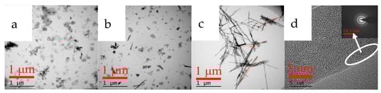 SEM and TEM measurements were performed for the carbonized products generated at different times to further clarify the growth process of acicular yttrium carbonate crystals, and the results are shown in Figure 12 and Figure 13, respectively. Figure 12a shows that, when the carbonization time is t = 10 min, the morphology of the carbonized product is similar to that of yttrium hydroxide. The only difference is the formation of a small amount of needle-like products on the surface of the carbonization product after 10 min, and its surface is fluffier than that of yttrium hydroxide. As shown in the TEM image presented in Figure 13a, a small amount of needle-like products is mixed with the sheet-like yttrium hydroxide. At the initial stage of carbonization, the slurry system is weakly alkaline, and CO2 continuously dissolves into the liquid phase and rapidly reacts with OH− ionized by yttrium hydroxide to form HCO3−, which promotes a decrease in the pH of the system and the dissolution of aggregates of yttrium hydroxide nanoplatelets. Then, the Y3+ released by the dissolution of yttrium hydroxide encounters a large amount of HCO3− on the surface, increasing the supersaturation of yttrium carbonate and causing it to nucleate and grow heterogeneously on the surface of the yttrium hydroxide. After carbonization for t = 30 min, the yttrium hydroxide nanosheet aggregates further dissolved and collapsed, and the needle-like products appeared and the degree of fluffiness on the surface became increasingly obvious, as shown in Figure 12b. When the carbonization reaches t = 60 min, most of the yttrium hydroxide has been dissolved, more acicular yttrium carbonate nucleates and grows heterogeneously on the surface of the yttrium hydroxide, and characteristic peaks are observed for yttrium carbonate in the XRD pattern, as shown in Figure 12c. As shown in Figure 12, compared to the SEM image of the carbonized product at 10 min, the amount of flaky yttrium hydroxide produced after 60 min of carbonization is significantly reduced, while the needle-like products are increasing, which are also observed in the TEM image shown in Figure 13b. After carbonization with CO2 for t = 90 min, yttrium hydroxide was completely dissolved and carbonized to form needle-like yttrium carbonate, and its morphology was completely transformed into a needle-like stacked structure, as shown in Figure 11 and Figure 12d. We determined the structure of the nanoneedles by Pixelmator Pro in the TEM image. As shown in the TEM image in Figure 13c, yttrium carbonate is a needle-like crystal with a length of 1–2 µm and a width of 20–30 nm. As illustrated in the SAED and the high-magnification lattice fringe photos shown in Figure 13d, yttrium carbonate adopts a polycrystalline form with a lattice spacing of approximately 0.3 nm, corresponding to the (200) crystal plane of yttrium carbonate structure. At the same time, the high-magnification lattice fringe photos show multiple regular lattice fringe regions with a size of approximately 5–10 nm, indicating that acicular yttrium carbonate is composed of yttrium carbonate nanocrystalline grains with a size of approximately 5–10 nm. The change process is consistent with the XRD results shown in Figure 11.