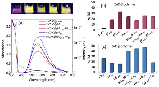 As it can be seen in Figure 2 and Table 2, the quantum yield (ΦF) of ZnO@polymer noticeably increases with the polymer protection, in agreement with previous reports [12,27]. Comparing the results obtained with the different polymeric coatings, polypropylene glycol methacrylate homopolymers (PGx) provide comparable protection for ZnO QDs to that provided by hydroxypropyl methacrylate homopolymers (HPx), which results in similar quantum yields (ΦF). However, the ΦF does not improve when ZnO nanoparticles are hybridized with EG-PG block copolymers. On the other hand, EG-HP block copolymers clearly increase the ΦF over the HP homopolymers; in special ZnO QDs coated with EG21k-HP5k block copolymer, the ΦF reached 43%. In the case of HP polymers, a clear influence in terms of the molecular weight is observed, specifically, the increase in the size of the hydrophilic EG block improves the fluorescence quantum yield. On the contrary, the increase in the size of the more hydrophobic hydroxylated HP block produces a detriment in the quantum yield for both homo- and block copolymer ligands (Table 2 and Figure 2c).