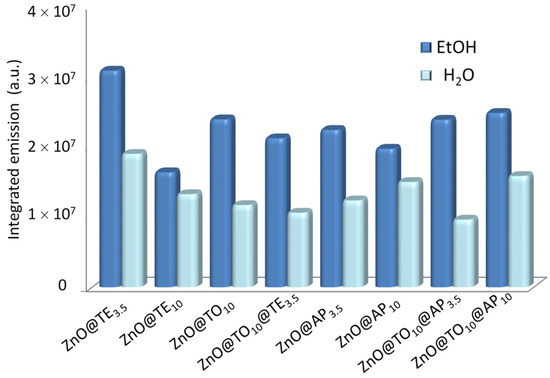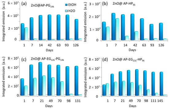 In Figure 5, the evolution of the integrated emission in ethanol and water are presented for selected ZnO@AP-polymers. For all samples investigated, it is observed that the emission noticeably increases in ethanol after 7 days, remaining practically unchanged during the entire period investigated. When transferring the hybrid ZnO QDs to water, the λem. max. experiences a red shift compared to those in ethanol (Table 4), while the fluorescence emission decreases after 7 or 14 days in the case of the samples synthesized with APTES in combination with PG14k or HP6k homopolymers, respectively.