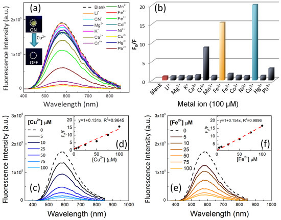 (a) Selectivity of ZnO@HP6k towards different metal ions ([Metal ion] = 100 μM); (b) ratio between initial integrated emission and integrated emission (F0/F) of ZnO@HP6k in the presence of 100 μM of the indicated metals; (c) decrease in fluorescence emission of ZnO@HP6k as a function of Cu2+ concentration (5–100 μM); (d) Stern–Volmer plot corresponding to ZnO@HP6k quenched by Cu2+; (e) decrease in fluorescence emission of ZnO@HP6k as a function of Fe2+ concentration (5–100 μM); (f) Stern–Volmer plot corresponding to ZnO@HP6k quenched by Fe2+.