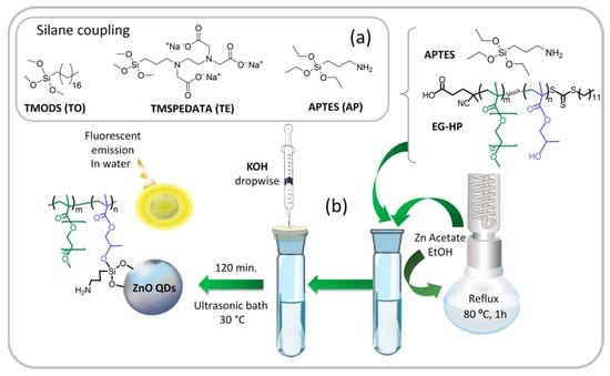 (a) Silane coupling agents for the synthesis of hybrid ZnO QDs. (b) Procedure for the synthesis of ZnO QDs protected with a mixture of APTES and EG-HP block copolymer.
