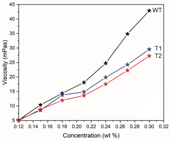The viscosities of the different CNF suspensions were evaluated at different concentrations of 0.30–0.12 wt% at 0.03 wt% intervals and are shown in Figure 1. As seen in Figure 1, the viscosities of T1 and T2 were lower than those of WT at higher concentrations. At 0.30 wt%, the viscosities plateaued at 52, 37, and 33 mPa·s for WT, T1, and T2, respectively. While the viscosities did not differ between the suspensions at lower concentrations, the presented viscosity trends indicate differences between the CNFs from T1 and T2 compared to WT. Factors that can influence viscosity include the aspect ratio of CNFs [29], the volume fraction of fine CNFs [30], and the ionic strength and pH [31,32].