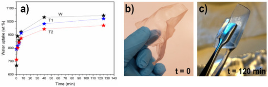 The manufactured networks were tested for their capacity to bind water prior to hot-pressing into dry networks. Water uptake is shown in Figure 3 together with the representative visual appearance of WT for all samples, before and after swelling, to the maximum capacity. Networks made from the CNF suspensions could absorb approximately 900–1100% of their initial weight, with a slightly lower capacity for T2 (~900 ± 30%) compared to WT (~1100 ± 40%). The capacity of T1 was indistinguishable from that of both WT and T2, where the values were within the error margins of T2 and WT. The difference between the WT and transgenic plants was supported by the slightly higher degree of carboxylation of the solids in the WT-CNF suspensions and their corresponding increased surface area (Table 1). The difference in water uptake and overall surface area can be associated with the lower carboxylate content in the transgenic CNFs than in WT-CNF. It is known that the CNFs with a higher degree of carboxylation show a higher affinity for swelling in water [42].