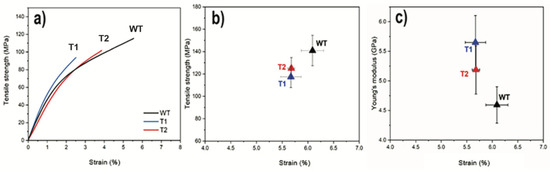 The tensile strength, strain, and Young’s modulus of the final dense and homogenous hot-pressed networks are shown in Figure 4a,b. The strength and maximum strain were lower for both transgenic samples T2 (125 ± 10 MPa; 5.7 ± 0.1%) and T1 (117 ± 10 MPa; 3.4 ± 0.7%) compared to WT (141 ± 14 MPa; 6.1 ± 0.2%). Interestingly, the stiffness, shown in Figure 4c, showed the opposite behavior with the lowest modulus for the WT (4.6 ± 0.3 GPa) compared to that of T1 (5.6 ± 0.5 GPa) and T2 (5.1 ± 0.1 GPa). However, when considering the standard deviations, no significant differences between the average values of T2 and WT were observed.