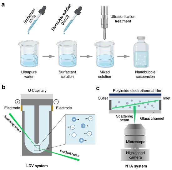 Sketch of bulk nanobubbles generation and characterization. (a) Bulk nanobubbles are generated by ultrasonic cavitation method. The surfactant and electrolyte solutions are prepared prior to ultrasonication. (b) The nanobubbles are characterized with laser Doppler velocimetry (LDV) combined with an electrophoresis technique and (c) nanoparticle tracking analysis (NTA) system.