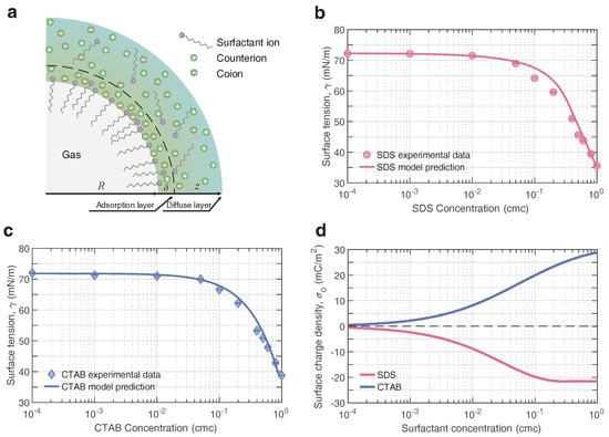 The surface tension thus could be calculated via Equations (1)–(7). Here, to verify the applicability and accuracy of the model, two ionic surfactants, anionic surfactant (SDS) and cationic surfactant (CTAB), were considered. Experimentally, we measured the air–liquid interfacial tension of surfactant solutions over a wide range of bulk concentrations. Figure 4b,c plot the calculated surface tension against experimental measurements for the SDS and CTAB solutions, respectively, indicating a very close agreement within four orders of magnitude between and 1 cmc for both. Taking the adsorption feature of the surfactant and the adsorption layer thickness at the interface into consideration, this model was amenable and universal for the premicellar dilute solutions ().