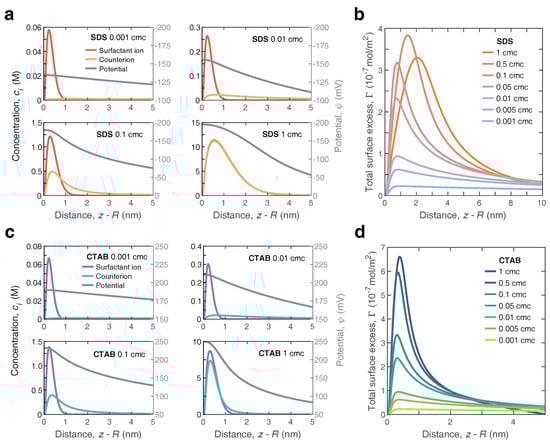 To gain a better insight into the underlying mechanism of adsorption, we now turn back to the details of the surface potential and ion distributions surrounding the nanobubbles. For the nanobubbles immersed in SDS solution, Figure 5a shows a series of computed spatial distribution of surfactant ions () and counterions () across the nanobubble interface (left y-axis). These four cases ( = 0.001, 0.01, 0.1 and 1 cmc) were representative of all the cases considered. Generally, both the surfactant ions and counterions appeared to reach a plateau value very close to the interface (∼), exhibiting an intense affinity for the interface. The concentrations of both decayed rapidly as they approached the sharp air–water interface indefinitely (<). At a long enough distance (), these two profiles coalesced to a single decay. The decay distance varied from ∼ to ∼ with an increasing SDS concentration. However, surfactant ions () displayed a greater propensity to gather near the air–water interface than counterions () and tended to reside in the adsorption layer. At surfactant concentrations close to CMC, the counterions behaved similarly to the anions, and they overlapped extensively. Under this case, the surfactant layer was effectively screened by the counterion layer, even though the adsorption layer became denser. Nonetheless, the shape of the profiles within the thickness range of the adsorption layer was quite sensitive to the bulk concentration of ionic surfactants, essentially demonstrating that incorporating the effect of the adsorption thickness was crucial in the development of adsorbing dynamics. The corresponding electrical potential as a function of radial distance near the nanobubble interface was also calculated and is shown in Figure 4a (right y-axis). Clearly, with an increasing SDS concentration, the decayed faster away from the interface. Moreover, the shape of the potential profiles in the interface region behaved significantly distinctly from that obtained by the MPB model, i.e., as shown in our current work []. The potential predicted in this model was significantly higher than in the previous one owing to the difference in the definition of the surface. In Figure 5b, we further display the total surface excess as a function of the distance away from the interface. Clearly, for all cases, the surfactant ions () had a positive accumulation. As the bulk SDS concentration increased, the peak displayed a shift away from the air–water interface with a magnitude increasing remarkably.