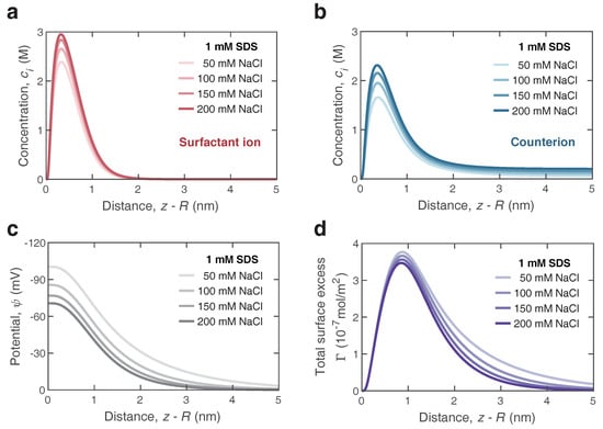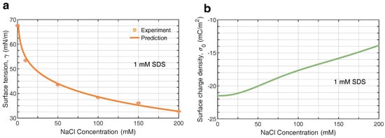 Further, we extended the adsorption model to describe the surface characteristics of bulk nanobubbles in the surfactant/electrolyte solutions. On the basis of the previous surfactant-counterion model, the influence on the mean field of potential arisen from the added electrolyte should be taken into consideration. For SDS/NaCl solutions, the parameters were (where c is the bulk concentration of salts in mM) and nm. Figure 6a,b depict the profiles of surfactant ions and counterions in the vicinity of bulk nanobubbles, respectively, which were calculated with Equations (1) and (2). Here, we considered the distribution of surfactant ions and counterions in a solution with a constant bulk concentration of 1 mM SDS and a varying NaCl concentration ranging from 50 mM to 200 mM. The peaks of surfactants ions and counterions rose with the increasing concentration of electrolyte, indicating that the addition of electrolyte enhanced the adsorption of surfactant ions as well as counterions. It may be explained by the fact that the ions screened the electrostatic potential, allowing more surfactant molecules to adsorb to the surface of bulk nanobubbles. The preliminary conjecture was confirmed by the results of the electrical potential in Figure 6c. The addition of NaCl reduced the electrical potential at the air/water interface in the SDS solution significantly, due to the enhanced ion shielding effect. With an increasing distance away from the surface of bulk nanobubbles, the potential gradually dropped to zero within 5 nm due to the presence of NaCl in the SDS solution. The higher the concentration of NaCl, the faster the potential decayed. Since the adsorption was effective at a very close distance, the surfactant ions were concentrated near the interface and formed an adsorption layer. In contrast, the ion distribution in the diffuse layer was dominated by the electrostatic energy. According to the profiles of ion distribution, it could be found that more surfactant ions gathered at the interface with the addition of electrolytes in the surfactant solution, leading to a higher surface excess and a further lower surface tension. It was verified by the results of the surface tension predicted and measured in Figure 7a. Even with only 1 mM SDS, the surface tension of the aqueous solution could drop to 32 mN/m, which was lower than the surface tension of SDS near the CMC. Note that the concentration of 0 mM NaCl marks the SDS solution without any electrolytes added. Figure 7b shows the effect of NaCl on surface charge density. As the concentration of NaCl increased from 0 mM to 200 mM, the magnitude of bubble surface charge density declined to −14 gently. A similar trend with increasing concentration of NaCl was found in the experimental results of the zeta potential in Figure 2a. Overall, the addition of electrolytes to the surfactant solution easily made charged bubbles screened by counterions, which meant a reduction in colloidal stability.