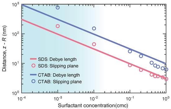 When the bubble is electrically neutral at a very close distance from the surface, it is easier to coalesce when moving randomly in solution. In other words, the spatial distribution of surfactant ions and counterions determines the position of the slipping plane. It is well-known that the zeta potential is the electrical potential at the slipping plane, which is a scientific term for colloidal electrokinetics. The zeta potential relies on the location of the slipping plane exceedingly. The accurate measuring plane around the nanobubble has been under controversy due to the lack of well-recognized depiction about the relation between potential and location. Here, we determined the slipping-plane location by substituting the measured zeta potential of bulk nanobubbles into the potential profile obtained with this model. Prior to ultrasonic treatment, the ionic surfactants were dispersed in the pure water. As shown in Figure 8, the slipping-plane positions of nanobubbles suspended in SDS and CTAB solutions were both almost located within the Debye layer (<), which was in accordance with the assumption of the double layer theory. However, note that when the concentration of added surfactant was low, namely < cmc (see the shaded area), the zeta potential was located beyond the Debye thickness. This discrepancy seems puzzling and may be traced to the fact that potential measurements are sensitive to charge carriers. If there are few charged carriers in the solution, the spatial distribution of the potential shows a slow decay far away the interface (as shown in Figure 5), which brings certain difficulties to accurately locate the experimental measurements. This issue needs to be further investigated by designing precise experiments, such as taking into account the coupling effect of ionic surfactants and coexisting ions, which is what we plan to do next.