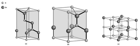 The hexagonal wurtzite, cubic zinc blende, and rock salt shown in Figure 1 are the three known crystalline phases of ZnO. ZnO is commonly found in the wurtzite phase because it is stable under ambient conditions. Both the rock salt and the zinc blende are cubic and unstable under ambient conditions. Growing the zinc blende on cubic substrates makes it stable, whereas the rock salt phase can be obtained by converting ZnO under relatively high pressure [32]. The wurtzite phase belongs to the P63mc space group and has a hexagonal geometry with two interconnecting sublattices of Zn2+ and O2− such that each Zn ion is surrounded by four tetrahedral O2− ions and vice-versa. This geometry lacks inversion symmetry along the hexagonal axis giving rise to a polarity symmetry and resulting in piezoelectric and spontaneous polarisation properties [33].