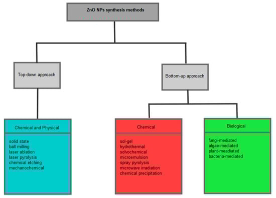 The chemical synthesis methods that fall under the bottom-up approach include sol-gel, hydrothermal, microwave irradiation, spray pyrolysis, chemical precipitation, solvochemical, microemulsion, etc. This approach involves nucleation of ions, atoms or molecules in solution followed by aggregation of the nanoparticles. It is the approach that has been extensively reported for the preparation of NPs. Both physical and chemical conventional synthesis processes mentioned above have been reported for the preparation of ZnO NPs. However, some of these conventional synthesis routes are limited by high energy consumption and high pressure and require complex equipment, resulting in a high overall cost [37,38]. Moreover, these methods can also be limited by toxic chemicals used during synthesis, which can be harmful to the environment and the person handling the chemicals. These toxic chemicals are mostly used as reducing agents or capping agents and include sodium borohydride, hydrazine, ethylene glycol, dimethylformamide, cetyl trimethylammonium bromide (CTAB), pyridine, polyethylene glycol, etc. [39]. Therefore, safer and cost-effective synthesis methods are needed for the preparation of NPs. Thus, green synthesis using microorganisms or plant extracts can be a substitute to conventional chemical and physical synthesis methods.