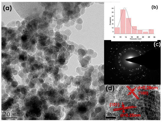 (a) TEM image of the synthesised ZnO NPs (b) with their size distribution (c), their SAED pattern and (d) High-Resolution Transform Electron Microscope (HRTEM) image. Adapted from [22].
