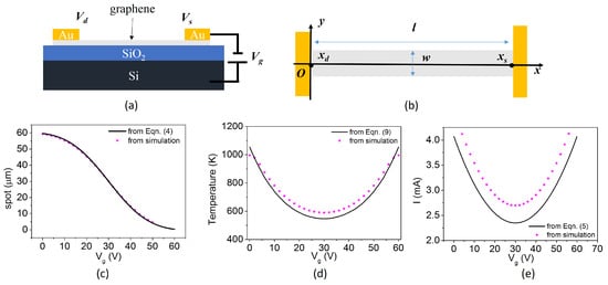 The hot spot location, maximum temperature, and current calculated from equations and simulations are compared in Figure 1c–e. Except that the current from simulations is a little higher than that from Equation (5), the position and maximum temperature on graphene are almost identical to those obtained by equations, confirming the validity of our theoretical model.