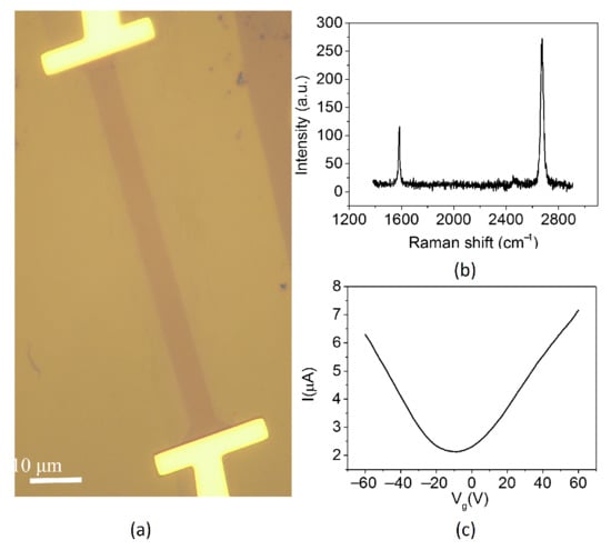 A graphene flake was mechanically exfoliated on a p-doped substrate covered with a 285 nm thick layer, and metal contacts were defined by electron-beam evaporation of Cr (5 nm) and Au (50 nm). In order to avoid the overheating at contacts due to contact resistance, the graphene was etched to a shape narrow in the middle but wide on both sides, as shown in Figure 2a–c, which shows the Raman spectrum of the graphene emitter after fabrications and the field effect characteristic of the graphene emitter with a bias voltage at 0.1 V after annealing in a vacuum chamber.