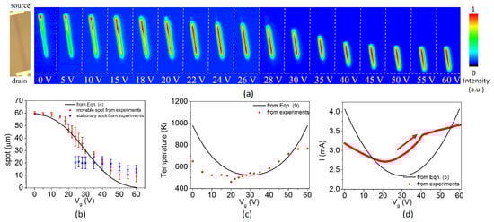 Through correcting the infrared CCD with a blackbody (590 K–740 K), temperatures of hot spots in Figure 3) could be obtained and plotted with dots in Figure 3b. Although some measured temperatures at low gate voltages are lower than those from Equation (9), measured temperatures at higher gate voltages are close to those from Equation (9). The temperature deviation at low gate voltages could be attributed to the emission process from electron traps in the underlying substrate [,], as the experimental transfer current curve shifts by about 10 V compared with the result from Equation (5). Low current leads to a decrease of the maximum temperature of graphene.