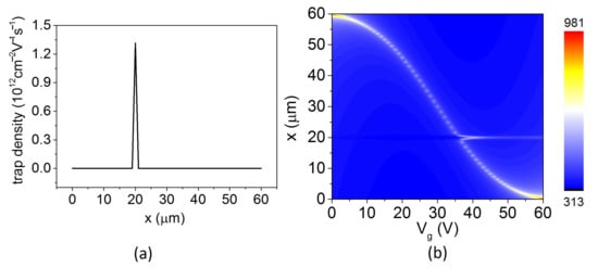 Interestingly, we found that a stationary light spot appeared at a place about 20 m from the drain when extracting the brightest light from Figure 3a, as plotted with blue dots in Figure 3a. This spot almost remained unmoved when changed, which could be caused by locally trapped charges in the oxide that produce image charges in graphene []. In view of this, the density carrier equation could be modified by introducing a locally trapped charges function (), as shown in Figure 4a. Then, Equation (6) is rewritten as