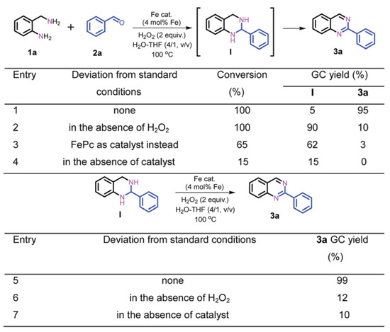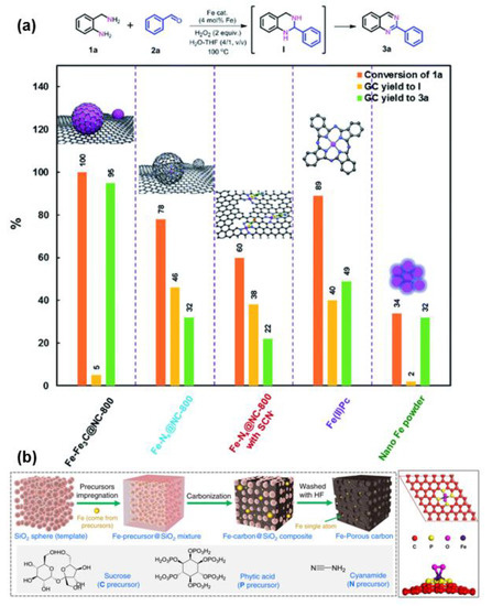 - Ma, Z.; Song, T.; Yuan, Y.; Yang, Y. Synergistic catalysis on Fe-Nx sites and Fe nanoparticles for efficient synthesis of quinolines and quinazolinones via oxidative coupling of amines and aldehydes. Chem. Sci. 2019, 10, 10283–10289. [Google Scholar] [CrossRef]
