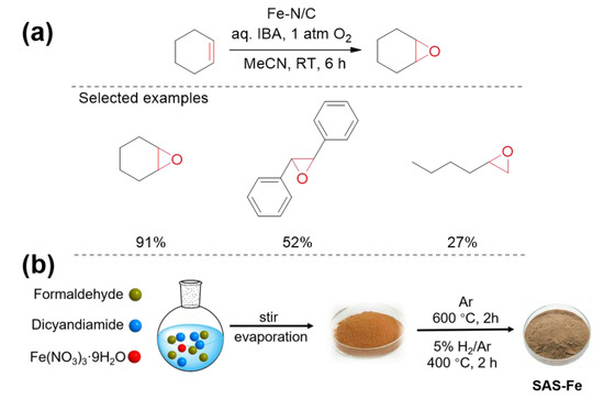 - Malko, D.; Guo, Y.; Jones, P.; Britovsek, G.; Kucernak, A. Heterogeneous iron containing carbon catalyst (Fe-N/C) for epoxidation with molecular oxygen. J. Catal. 2019, 370, 357–363. [Google Scholar] [CrossRef]