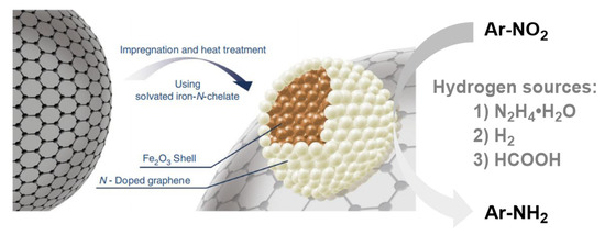 - Jagadeesh, R.V.; Natte, K.; Junge, H.; Beller, M. Nitrogen-Doped Graphene-Activated Iron-Oxide-Based Nanocatalysts for Selective Transfer Hydrogenation of Nitroarenes. ACS Catal. 2015, 5, 1526–1529. [Google Scholar] [CrossRef]