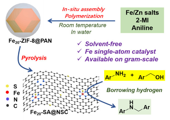 - Lu, G.P.; Shan, H.B.; Lin, Y.M.; Zhang, K.; Zhou, B.J.; Zhong, Q.; Wang, P.C. A Fe single atom on N, S-doped carbon catalyst for performing N-alkylation of aromatic amines under solvent-free conditions. J. Mater. Chem. A 2021, 9, 25128–25135. [Google Scholar] [CrossRef]