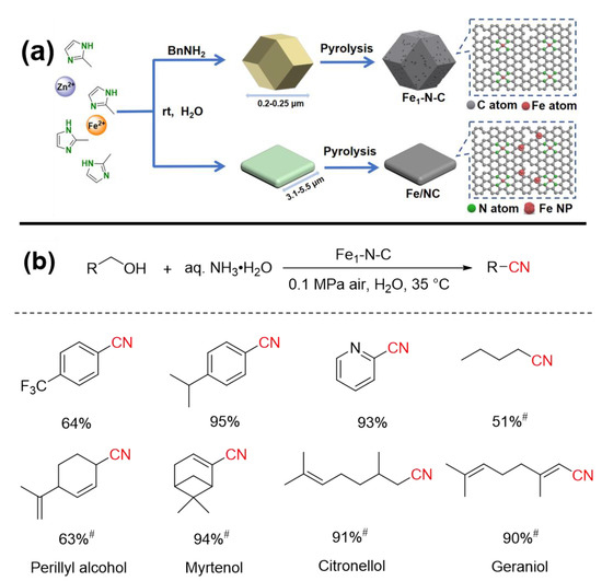 - Sun, K.K.; Shan, H.B.; Neumann, H.; Lu, G.P.; Beller, M. Efficient iron single-atom catalysts for selective ammoxidation of alcohols to nitriles. Nat. Commun. 2022, 13, 1848. [Google Scholar] [CrossRef] [PubMed]