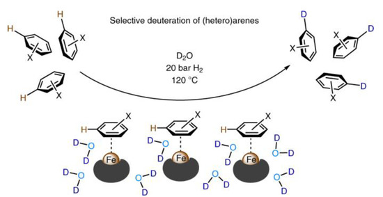 - Li, W.; Rabeah, J.; Bourriquen, F.; Yang, D.; Kreyenschulte, C.; Rockstroh, N.; Lund, H.; Bartling, S.; Surkus, A.-E.; Junge, K.; et al. Scalable and selective deuteration of (hetero)arenes. Nat. Chem. 2022, 14, 334–341. [Google Scholar] [CrossRef] [PubMed]