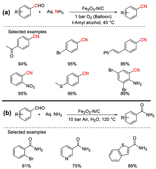 - Murugesan, K.; Senthamarai, T.; Sohail, M.; Sharif, M.; Kalevaru, N.V.; Jagadeesh, R.V. Stable and reusable nanoscale Fe2O3-catalyzed aerobic oxidation process for the selective synthesis of nitriles and primary amides. Green Chem. 2018, 20, 266–273. [Google Scholar] [CrossRef]