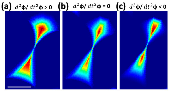 So far, we have discussed integration of φ corresponding with a continuously changing tilt of substrate at a constant angular velocity. Herein, we introduce a new control parameter called angular acceleration to modulate shapes of 3D lattice structures using NSL. In case of accelerated substrate rotation, the deposition time corresponding with each step of φ are unequal. At lower φ, the deposition time is longer, whereas for higher φ values, it is shorter, resulting in a thicker deposition at lower φ compared with higher φ. The shape also depends on the value of acceleration. Thus, the structures can be engineered by changing the equation of motion of the substrate. The effect of accelerated φ integration is studied on the nanocomet structure of Figure 2a. Figure 3a–c shows structures from positive, zero, and negative acceleration, which are significantly different from each other (Figure 3b is the same as Figure 2a Panel 3).