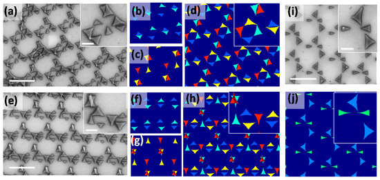 In Figure 5, the nanostructures were produced using four-fold symmetry. It is a quantitative addition of two times the two-fold symmetry perpendicular to each other, resulting in θ = θi and θi + (90, 180, and 270°). Figure 5a,e depicts the SEM images for two different θi (15 and 355°, respectively) at a constant φ of 25°. A bunch of eight triangles forming a unit cell makes the crystal structure more interesting. The orientation of triangles in Figure 5a,e are explained by the simulation results in Figure 5b–d and Figure 5f–h, respectively. Figure 5b,c and Figure 5f,g are the two two-fold symmetry results that have a relative phase δθi = 90°. The lattice structure of Figure 5b,c resembles Figure 4e, whereas Figure 5f,g resembles Figure 4d,f. Figure 5d,h shows the superposed image of Figure 5b,c,f,g, respectively, which are in a good agreement with the experimentally observed structures in Figure 5a,e. Figure 5i,j shows the experimental and corresponding simulation images from the two-step deposition (φ = 25°, θ = 0 and 90°). Unlike the symmetry structures discussed earlier, the structure is lacking symmetry in θ. However, it is the half of a four-fold symmetry or semi-four-fold symmetric which makes the crystal unique in this class. The angular parameters of Figure 5 are summarized in the following Table 1.