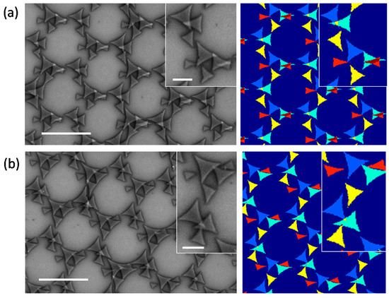 In Figure 6, four-fold deposition symmetries are obtained from a complex gyration of the sample, having simultaneously varying θ and φ. The value of the angular parameters for the four depositions are θ = θi, and θi + (90, 180, and 270°) and φ = 15, 18, 22, and 29°. The left panel of Figure 6a,b are the SEM images for θi = 113 and 130°, respectively. The right panels are the corresponding simulation results. A set of eight triangles of different sizes form unit cell structures consistently repeated over the substrate. The unit cells from both the experiment and simulation are shown in the inset, which are consistent with one another. With every change in θi, the triangles reshuffle their positions with respect to one another, due to the shifted shadow position, giving rise to new complex periodic nanostructures, as shown in the examples of Figure 6a,b.