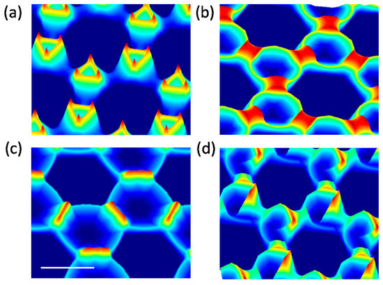 Simulated structures at (a–c) constant φ and (d) contentiously varying φ, upon full rotation of θ. Scalebar correspond to 1 µm.
