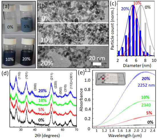 - Nütz, T.; zum Felde, U.; Haase, M. Wet-chemical synthesis of doped nanoparticles: Blue-colored colloids of n-doped SnO2:Sb. J. Chem. Phys. 1999, 110, 12142. [Google Scholar] [CrossRef]
