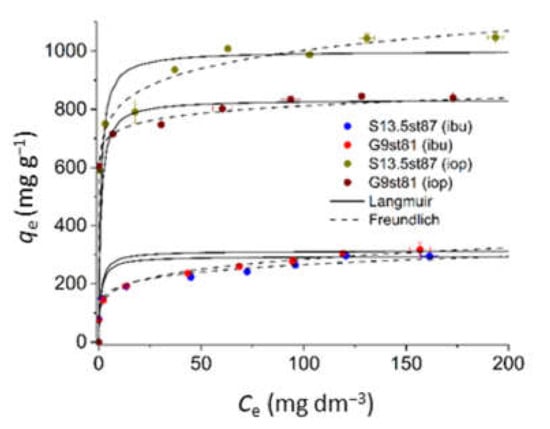 3.2. Ibuprofen and Iopamidol Adsorption onto Carbon Adsorbents