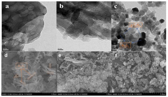 The TEM images of the synthesized (a) Bi2S3, (b) g-C3N4, and (c) Bi2S3@g-C3N4. The SEM images of the synthesized (d) Bi2S3, (e) g-C3N4, and (f) Bi2S3@g-C3N4.