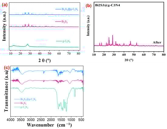 XRD and FTIR analysis results. (a) The XRD patterns of the synthesized Bi2S3@g-C3N4, Bi2S3, and g-C3N4 before the photocatalytic test. (b) The XRD analysis of the synthesized Bi2S3@g-C3N4 after the photocatalytic test and the (c) FTIR spectra analysis of the prepared Bi2S3@g-C3N4, Bi2S3, and g-C3N4.